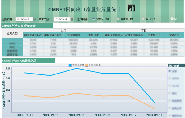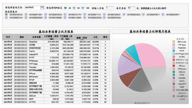 数据服务作为数据存储和处理软件,每日完成3000万条数据的存储。数据服务BI作为分析平台,完成流量流速统计、网间出口流量统计(分地市)、网间出口流量流向统计、网间出口流量的流向统计(分运营商分省)、网间出口流量业务量统计、网间出口流量的业务量统计(分地市)、业务TOPN流量排名、业务TOPN具体应用流量排名、热点域名TOPN排名、单IP流速TOPN排名等分析。